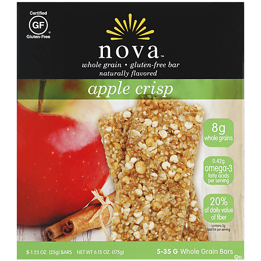Whole grain. Gluten-free bar. Naturally flavored. Certified gluten-free. 8 g whole grains. 0.42 g omega-3 fatty acids per serving. 20% of daily value of fiber. Contains 3 g total fat per serving. Nutrition + taste. Brighten your day. Dry ripened apples and sweet cinnamon. Excellent source of fiber.