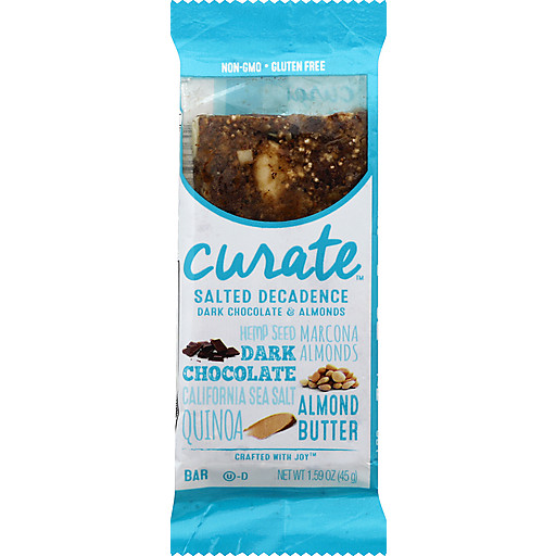 Curate™ Salted Decadence Bar Dark Chocolate & Almonds. Non-GMO. Gluten free. Hemp seed marcona. Dark chocolate almonds. California sea salt. Quinoa. Almond butter. Crafted with Joy™. Curate started with a small group of passionate, health-focused people who wanted to be excited about snacking again. We asked ourselves a simple question - why does "good for you" have to mean "boring". So we began crafting delightful combinations of carefully selected ingredients, and artfully mixing them into flavors that deliver an extraordinary snacking experience. The result A curated collection of simple ingredients combined in ways that are completely unexpected and absolutely delicious. So take a bite, and challenge your snacking expectations. Come explore new ways to snack at curatesnacks.com. We curate only the good Stuff™.†Contains 12g of total fat per serving. See nutrition information for fat content.