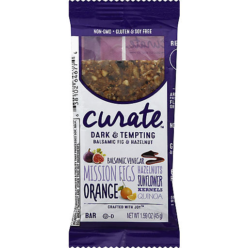 Curate™ Dark & Tempting Balsamic Fig & Hazelnut Bar. Balsamic vinegar. Mission figs. Hazelnuts. Sunflower kernels quinoa. Orange. Crafted with Joy™. Non-GMO. Gluten & soy free. Crafted with joy. Curate started with a small group of passionate, health-focused people who wanted to be excited about snacking again. We asked ourselves a simple question-why does "good for you" have to mean "boring". So we began crafting delightful combinations of carefully selected ingredients, and artfully mixing them into flavors that deliver an extraordinary snacking experience. The result A curated collection of simple ingredients combined in ways that are completely unexpected and absolutely delicious. So take a bite, and challenge your snacking expectations. Come explore new ways to snack at curatesnacks.com.
