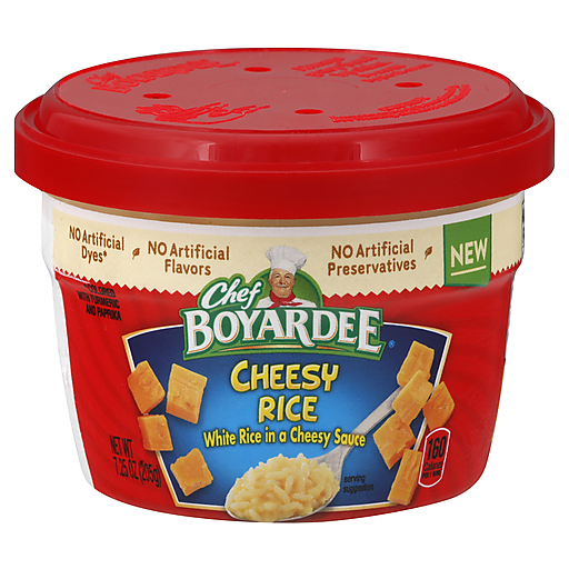 White rice in a cheesy sauce. No artificial flavors. 160 calories per 1 bowl. New. No artificial dyes (colored with turmeric and paprika). No artificial preservatives. www.chefboyardee.com. how2recycle.info. Questions, visit us at www.chefboyardee.com or call 1-800-544-5680.