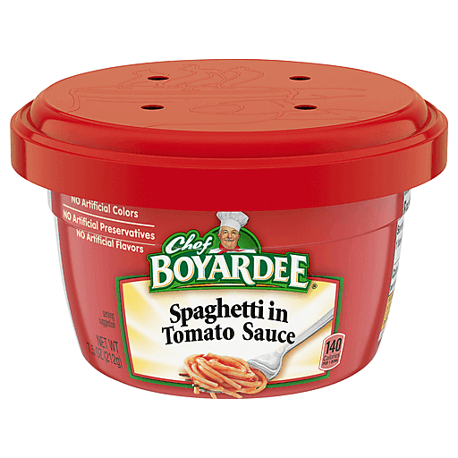 Enjoy 7.5-ounce microwavable cups of Chef Boyardee Spaghetti in Tomato Sauce at lunch, dinner or any time in between. Great for busy weeknights, these spaghetti cups for kids are ready in minutes. Simply heat in the microwave. Best of all, these Chef Boyardee Cups contain no artificial colors, no artificial flavors and no preservatives. Enjoy quality ingredients your family loves. Stock up on easy meals with Chef Boyardee Spaghetti in Tomato Sauce Microwavable Cups.