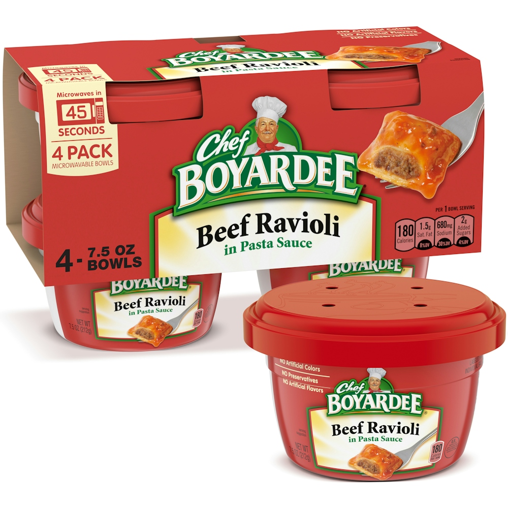 Enjoy classic beef ravioli flavor packed in microwavable bowls with quick and convenient prep for comforting family-friendly meals. Each package contains four 7.5 oz. bowls. Made with no artificial colors, flavors, or preservatives.