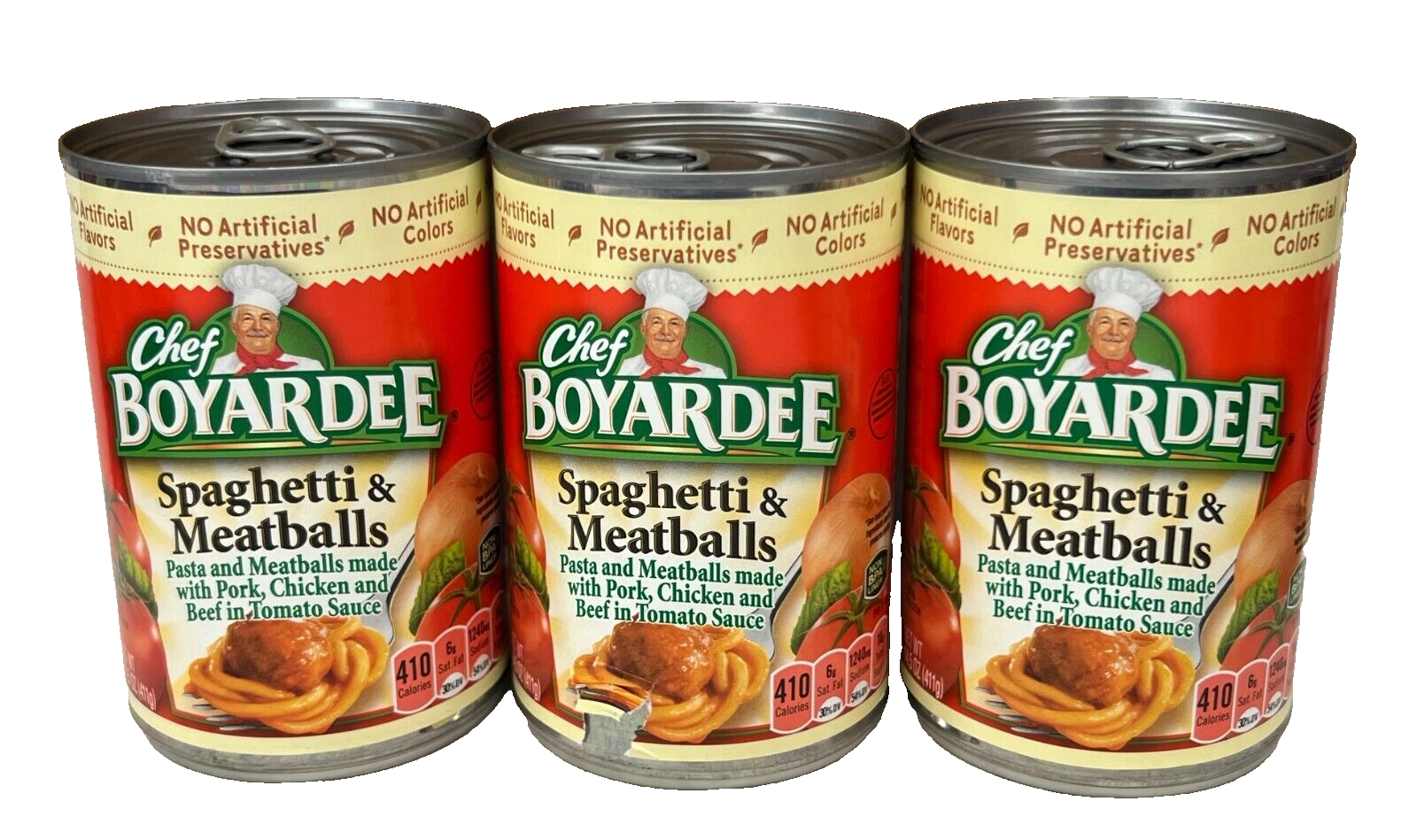 Canned, Jarred & Packaged Foods. Grocery & Gourmet Food. Packaged Meals & Side Dishes. Pantry Staples. Pasta & Noodle Dishes. Chef Boyardee Spaghetti and Meatballs is a delicious and convenient meal that is ready to eat in minutes and has delighted families for generations. Made with enriched pasta, rich, Italian-flavored tomato sauce, and tasty meatballs made with real beef, pork, and chicken, Chef Boyardee Spaghetti and Meatballs has the timeless flavor everyone loves. When you need a quick meal, Chef Boyardee has your back. Just pop off the easy-open lid, and in 90 seconds, dinner is ready to serve. Chef Boyardee Spaghetti and Meatballs is so simple and easy to prepare, you can grab it off the shelf for a quick and filling snack. Each 14.5 oz, easy-open can of Chef Boyardee Spaghetti and Meatballs contains 2 servings of meatballs, pasta, and tomato sauce, with 9 grams of protein and 260 calories per serving. With no artificial flavors, colors, or preservatives, Chef Boyardee makes a wholesome meal for kids of ALL ages.