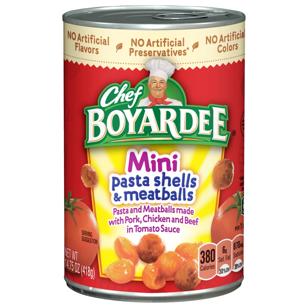 - The manufacturer of Pasta Shells & Meatballs Mini Pasta and Meatballs Made with Pork is Chef Boyardee.