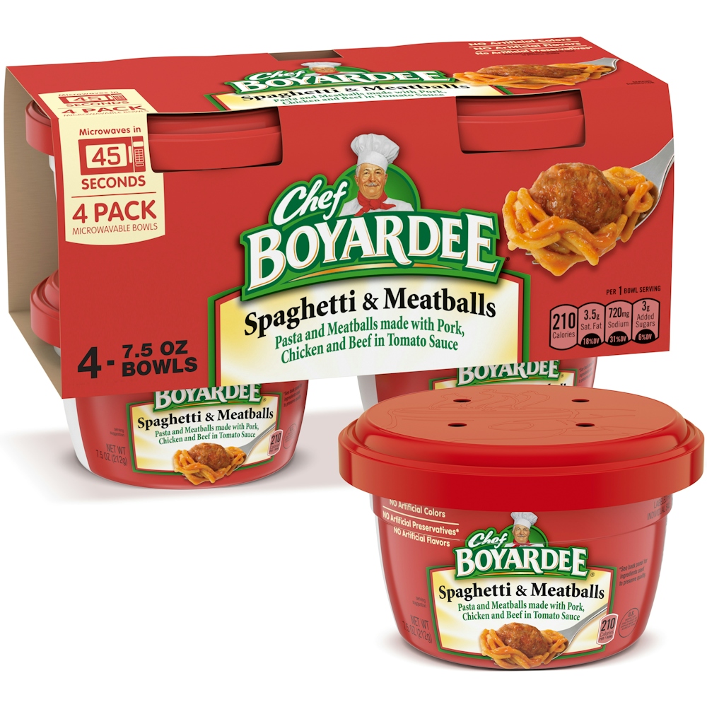 Enjoying a bowl of Chef Boyardee Spaghetti & Meatballs will remind you of your favorite comforting family recipes. Send your taste buds on an Italian-inspired journey with each bite of pasta and meatballs made with pork, chicken and beef in tomato sauce. This microwave meal is so easy to prepare, you can have easy, filling dinners, savory lunches or kid snacks in minutes without sacrificing that classic Chef Boyardee flavor. With no artificial colors, flavors or preservatives,* you can keep this family-friendly pantry staple on hand for meals in a pinch. Also, this easy-to-make dish will tantalize taste buds of all ages, including kids and kids at heart.
