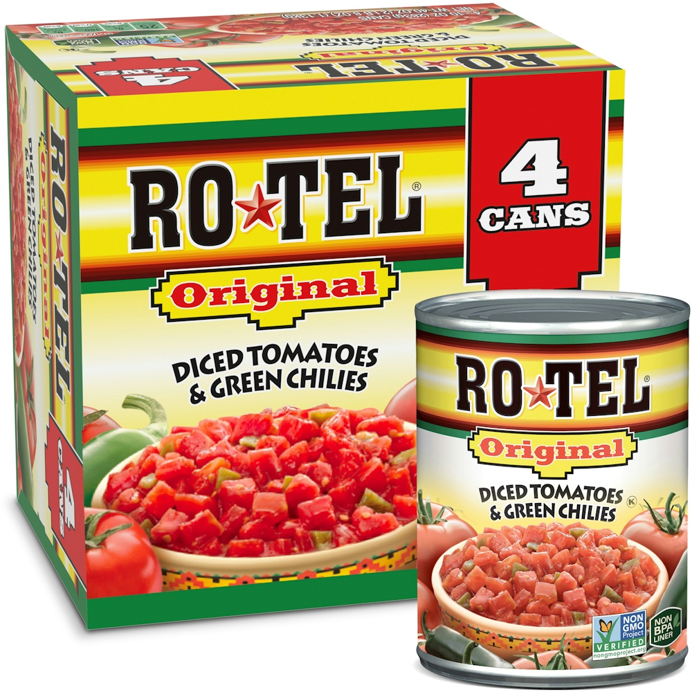 Original Diced Tomatoes and Green Chilies. Spice things up with Ro-Tel! Non-GMO Project verified. Non-BPA liner. 4 - 10-ounce cans per package.