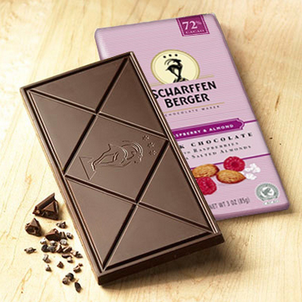 - The manufacturer of Dark Chocolate with Raspberries & Sea Salted Almonds is Scharffen Berger.