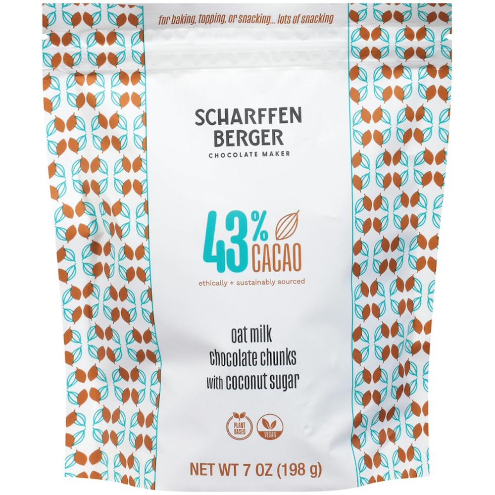- The manufacturer of 43% Cacao Oat Milk Chocolate Chunks with Coconut Sugar is Scharffen Berger.