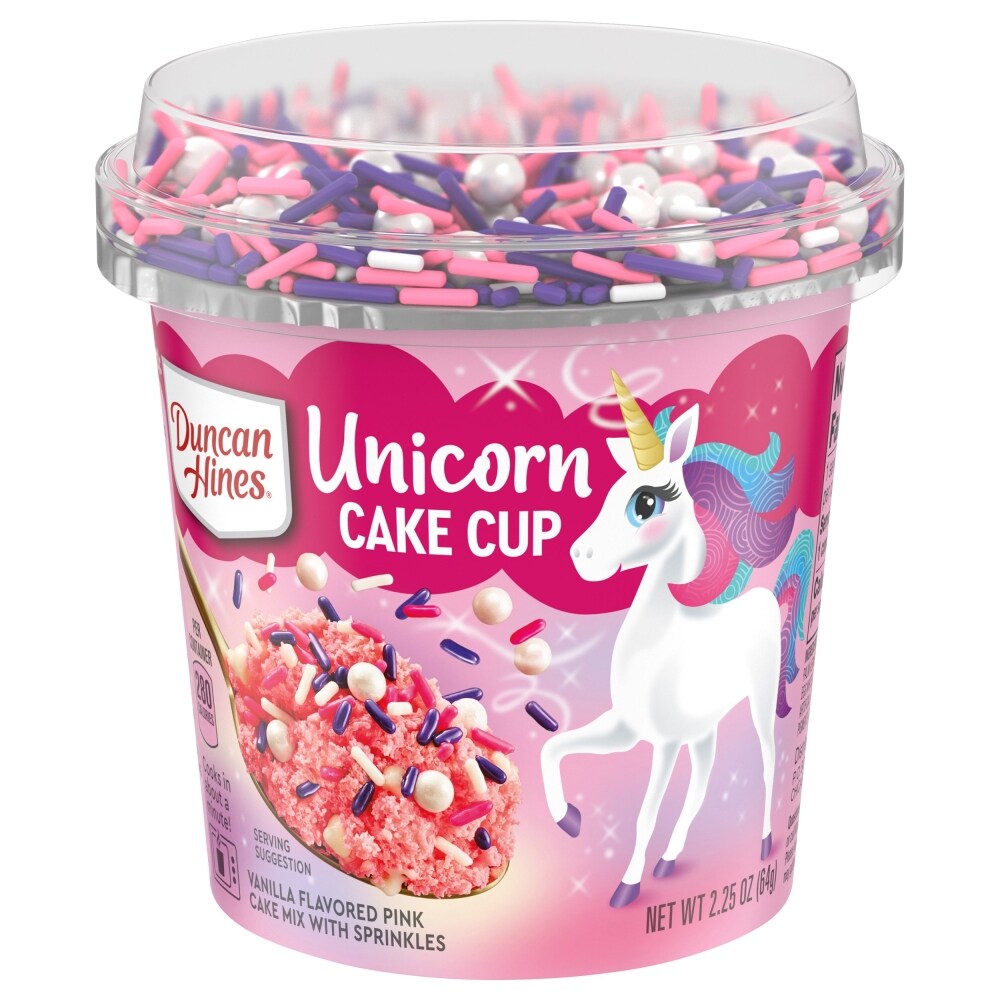 Enjoy a fun treat full of goodness with Duncan Hines Unicorn Cake Cup. This colorful pink cake mix bakes into a moist vanilla cake topped with sprinkles for a quick, warm and delightful treat. Pop this sweet dessert in the microwave as a weeknight delight or after school snack. Simply add water to the cup, stir well, and microwave for one minute. Let cool for two minutes before enjoying. Each microwave cake cup makes one delicious serving. From single serve cake to decadent brownie mixes, Duncan Hines has you covered when youâre ready to bake and create.
