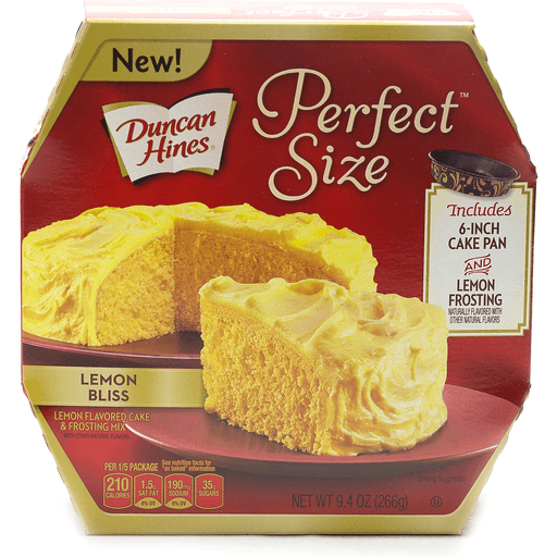 Duncan Hines® Perfect™ Size Lemon Bliss Lemon Flavored Cake & Frosting Mix. New! Includes 6-inch cake pan and lemon frosting. Naturally flavored with other natural flavors. With other natural flavors. Per 1/5 package. See nutrition facts for "as baked" information. 210 calories. 1.5g sat fat, 8% DV. 190mg sodium, 8% DV. 35g sugars. Duncan Hines® Perfect Size™ cakes are just the right size for 2 to 4 people. Try our other delicious flavors: Chocolate lover's. Golden fudge. Strawberries & creme. Red velvet dream. Phone: 1-800-362-9834. For easy recipes and tips go to duncanhines.com.
