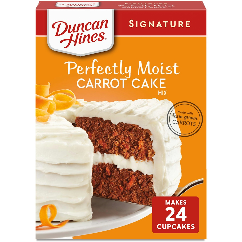 The Duncan Hines Signature Perfectly Moist Carrot Cake Mix can be used to prepare moist and delicious sheet cakes, layer cakes, cupcakes, and more. Gluten free and kosher certified, it is suitable for various dietary needs. The bulk case with 12 packs of Duncan Hines Carrot Cake Mix is ideal for supermarkets, convenience stores, and retail outlets.
