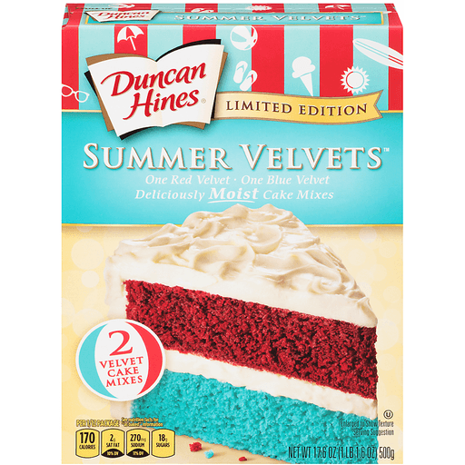 - The product category for Duncan Hines, Summer Velvets, Moist Cake Mix, Red Velvet, Blue Velvet is Baking Mixes.