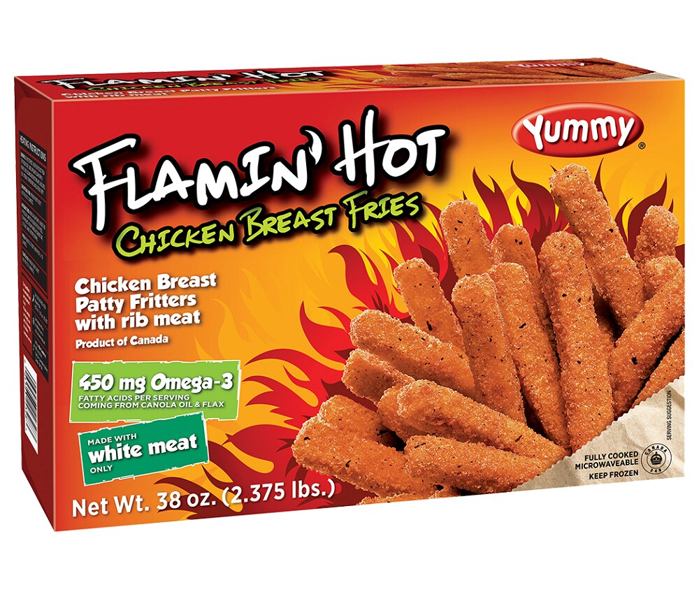 - The manufacturer of Flamin' Hot Chicken Breast Patty Fritters with Rib Meat, Flamin' Hot is Yummy.