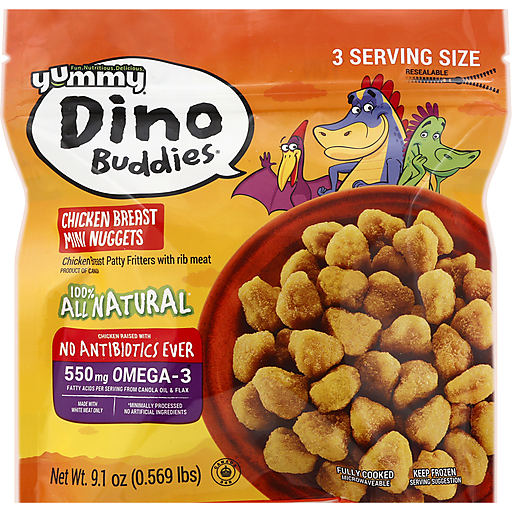 Chicken breast patty fritters with rib meat. 500 mg omega-3 fatty acids per serving from canola oil & flax. 3 serving size. Fun. Nutritious. Delicious. Resealable. Crunchy outside delicious inside. 100% all natural (minimally processed no artificial ingredients). Chicken raised with no antibiotics ever. Fully cooked. Microwaveable. Since 1998 Yummy has been delighting families. Great-tasting, superior quality, better-for-you chicken products that make mealtime easier. We are a small passionate company and pride ourselves in making great food that is fun, nutritious and delicious. These perfect bite-sized mini nuggets offer big-time satisfaction with a handful of nutrition that will make you smile. Chicken used raised without hormones. Federal regulations prohibit the use of hormones in poultry. www.maxi.com. www.yummydinobuddies.com. Your questions or comments are very important to us. Please contact us through one of the following, for a maxi customer service representative. 1-800-363-3621.