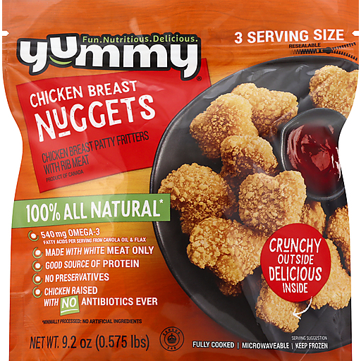 Chicken breast patty fritters with rib meat. 540 mg omega-3 fatty acids per serving from canola oil & flax. Good source of protein. 3 serving size. Fun. Nutrition. Delicious. Resealable.
