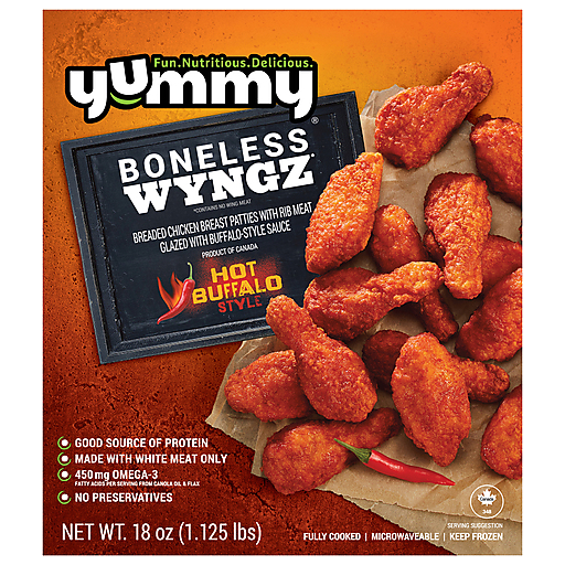 - The manufacturer of Hot Buffalo Style Boneless Wyngz Chicken Breast Patties with Rib Meat Glazed with Buffalo-Style is Yummy.