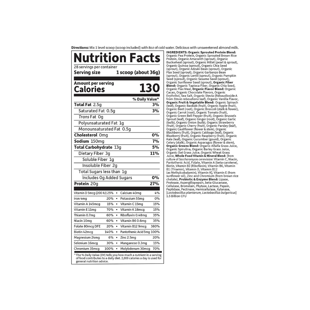 Raw Organic Protein Blend Organic Pea Protein, Organic Sprouted Brown Rice Protein, Organic Amaranth (Sprout), Organic Buckwheat (Sprout), Organic Millet (Pearl ,Sprout), Organic Quinoa (Sprout), Organic Chia Seed (Sprout), Organic Adzuki Bean (Sprout), Organic Flax Seed (Sprout), Organic Garbanzo Bean (Sprout), Organic Lentil (Sprout), Organic Pumpkin Seed (Sprout), Organic Sesame Seed (Sprout), Organic Sunflower Seed (Sprout) Raw Organic Fiber Blend: Organic Tapioca Fiber, Organic Chia Seed, Organic Flax Meal Organic Flavor Blend Raw: Organic Cacao, Organic Chocolate Flavors, Organic Erythritol, Sea Salt, Organic Stevia Extract (Leaf), Organic Vanilla Flavor Raw Organic Fruit , Vegetable Blend: Organic Spinach (Leaf), Organic Baobab (Fruit), Organic Apple (Fruit), Organic Beet (Root), Organic Broccoli (Stalk , Flower), Organic Carrot (Root), Organic Tomato (Fruit), Organic Green Bell Pepper (Fruit), Organic Brussels Sprout (Leaf), Organic Ginger (Root), Organic Garlic (Bulb), Organic Onion (Bulb), Organic Strawberry (Fruit), Organic Cherry (Fruit), Organic Parsley (Leaf), Organic Cauliflower (Flower , Stem), Organic Blackberry (Fruit), Organic Cabbage (Leaf), Organic Blueberry (Fruit), Organic Raspberry (Fruit), Organic Kale (Leaf), Organic Cucumber (Gourd), Organic Celery (Stalk), Organic Asparagus (Flower , Stem) Raw Organic Greens Blend: Organic Alfalfa Grass Juice, Organic Spirulina, Organic Barley Grass Juice, Organic Oat Grass Juice, Organic Wheat Grass Juice Raw Probiotic , Enzyme Blend: Lipase, Protease, Aspergillopepsin, Beta-Glucanase, Cellulase, Bromelain, Phytase, Lactase, Papain, Peptidase, Pectinase, Xylanase, Hemicellulase, [Lactobacillus Plantarum, Lactobacillus Bulgaricus] 1,5 Billion Cfu