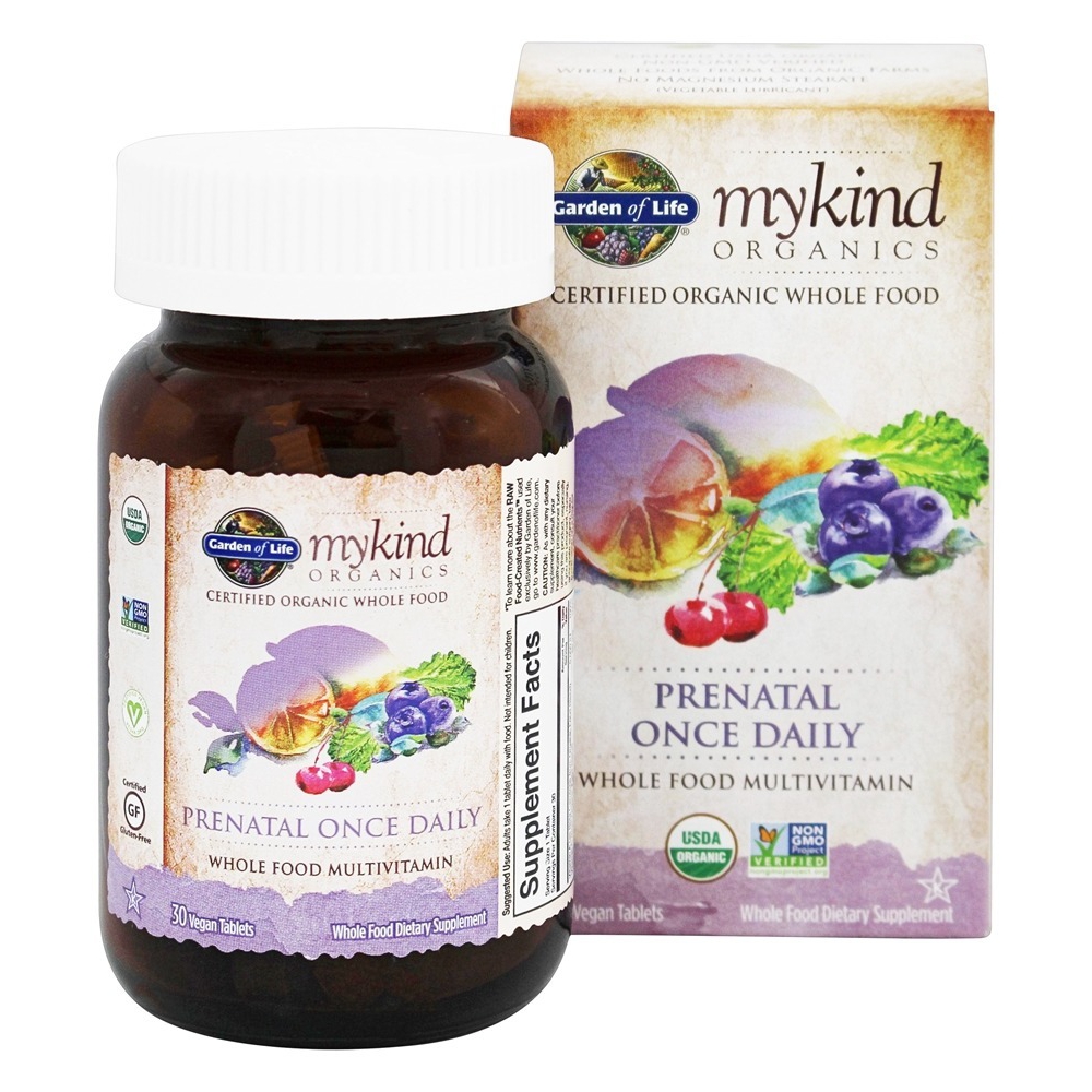 Garden of Life Organics Prenatal Once Daily Multivitamin is a Certified Organic, Non-GMO Project Verified, NSF Gluten-free, Vegan and Kosher prenatal multivitamin formula made from whole foods, free from synthetic binders and fillers. One daily tablet promotes healthy fetal development with 100% DV of Folate from Organic Lemon Peel and Vegan D3 from Lichen.† Mom also gets energy support with over 100% daily value of all B complex vitamins, including vitamins B6 and B12.† With our Clean Tablet Technology™, our tablets are easy-to-swallow and dissolve in less than 30 minutes, ensuring high bioavailability. Adults take 1 tablet daily with food. †These statements have not been evaluated by the Food and Drug Administration. This product is not intended to diagnose, treat, cure or prevent any disease.