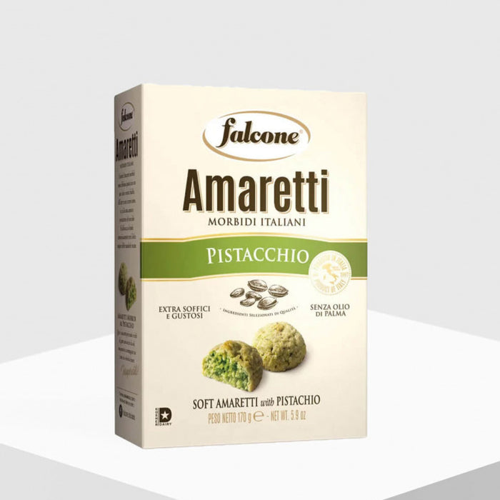 These particularly soft Amaretti bring original Italian flair to the home coffee cup - and not only look chic, they are also extremely delicious! The intense taste of pistachios and honey as well as the pleasantly light rum aroma harmonize perfectly with the complex taste structure of coffee, but these Amaretti also taste excellent with a cup of tea. This classic Italian pastry is made exclusively with high-quality ingredients and without palm oil, hardened fats or preservatives. The manufacturer Dolciaria Falcone produces these Amaretti pistachios in Pescara, an Italian city in Abruzzo, where Italian coffee roasters are also located. A better combination of coffee and matching pastries is hardly imaginable. Net Weight: 5.9 oz. Product of Italy.