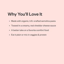 Made with non-GMO, U.S.-crafted semolina pasta Tossed in a creamy, real cheddar cheese sauce An organic take on a favorite comfort food Eat it plain or mix in veggies & protein.