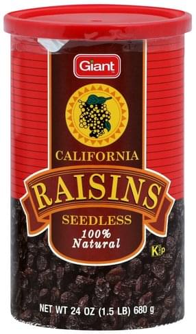 - The manufacturer of 100% Natural Seedless Raisins is Giant.