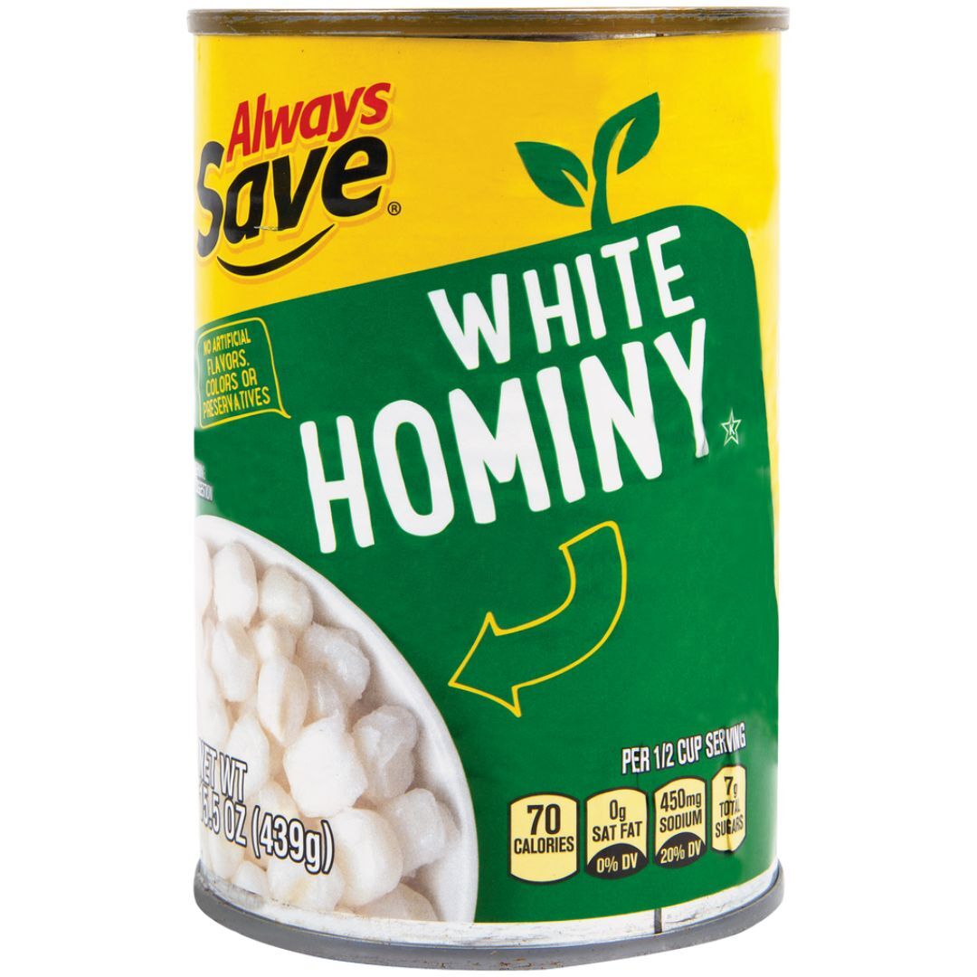 - The manufacturer of White Hominy is Always Save.