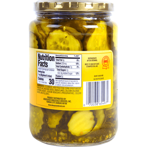 Cucumbers, High Fructose Corn Syrup, Water, Vinegar, Salt, Mustard Seeds, Onion Flakes, Calcium Chloride (Firming Agent), Sodium Benzoate (Preservative), Celery Seeds, and Yellow 5.