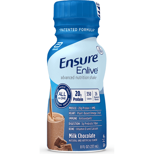 Ensure Enlive Meal Replacement Shake, 20G Protein, 350 Calories, Advanced Nutrition Protein Shake, Milk Chocolate, 8 FL Oz, 1 BottleWater, Corn Syrup, Sugar, Milk Protein Concentrate, Sodium Caseinate, Canola Oil, Cocoa Powder (Processed with Alkali), Corn Oil, Soy Protein Isolate, Short-Chain Fructooligosaccharides, Calcium Beta-Hydroxy-Beta-Methylbutyrate. Less than 0.