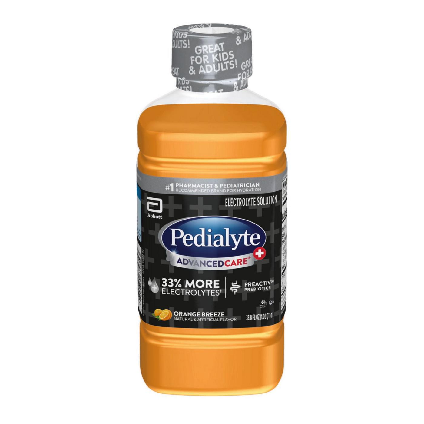 Pedialyte AdvancedCare Plus Electrolyte Solution is an advanced way to rehydrate quickly and replace lost fluids and electrolytes to feel better fast. Pedialyte AdvancedCare Plus is an electrolyte drink that has 33% more electrolytes* and is formulated to replenish electrolytes you may lose due to vomiting diarrhea or extreme perspiration caused by excessive heat or prolonged exercise. Pedialyte AdvancedCare Plus also has PreActiv Prebiotics to help promote a healthy digestive system. *60 mEq sodium electrolytes per liter vs 45 mEq in original Pedialyte. โ Mild to moderate dehydration.