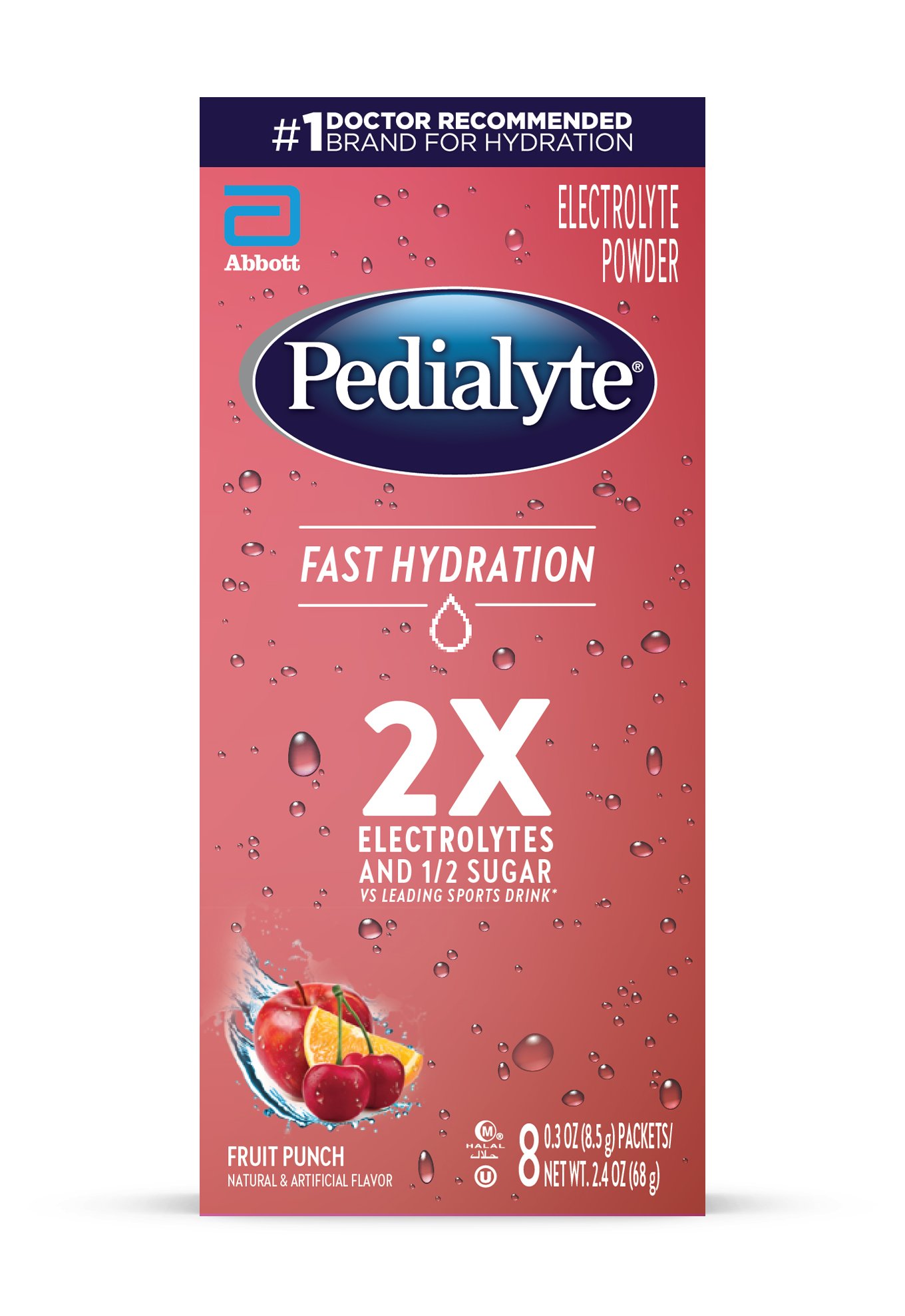 Pedialyte Fast Hydration electrolyte powder is designed for fast, effective rehydration. It has 2x the electrolytes and the sugar of the leading sports drink. Its also designed to replace fluids and electrolytes more effectively than common beverages, including water, sports drinks, juice, and soda. Enjoy great-tasting flavors from Pedialyte, the 1 doctor-recommended brand for hydration in the US; used by doctors and hospitals for over 50 years. Featured Pedialyte products have at least 1030 mg sodium and no more than 25 g sugars per liter; leading sports drink has 460 mg sodium and 58 g sugars per liter.
