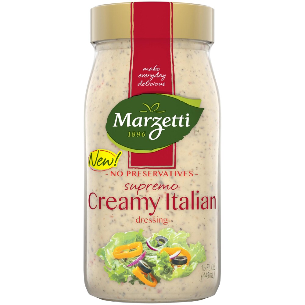Make everyday delicious. 1896. New! No preservatives. We want our dressings to add life to your crisp, fresh salads. So we're on a never-ending quest to make better dressings from better ingredients. We hope you'll love our Supremo Creamy Italian as much as we do. Questions or comments? www.marzetti.com; 1-800-999-1835.
