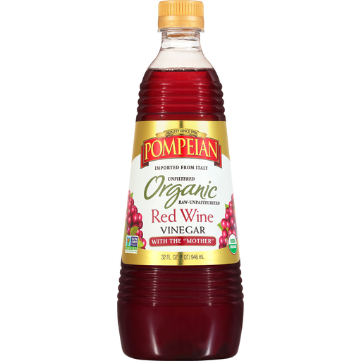 Organic Red Wine VinegarPompeian's unfiltered, unpasteurized, Organic Red Wine Vinegar is produced by using organically grown grapes from the Emilia Romagna region of Italy. Pompeian does not filter and does not pasteurize this vinegar in order to maintain its natural and genuine benefits, and to preserve the presence of the "mother' in the product, which is desired for its many health benefits and is a good addition to your daily diet. This gourmet vinegar is ideal for salad dressings, marinades, and sauces. Try adding this healthful vinegar in tea or other drinks. You'll not only enjoy the taste but you'll be benefitting from its healthy attributes. Pompeian's Organic Red Wine Vinegar is Certified Non-GMO by the Non-GMO Project Organization.