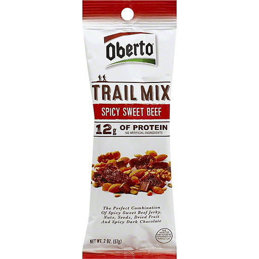 - The manufacturer of Spicy Sweet Beef Trail Mix is Oberto.