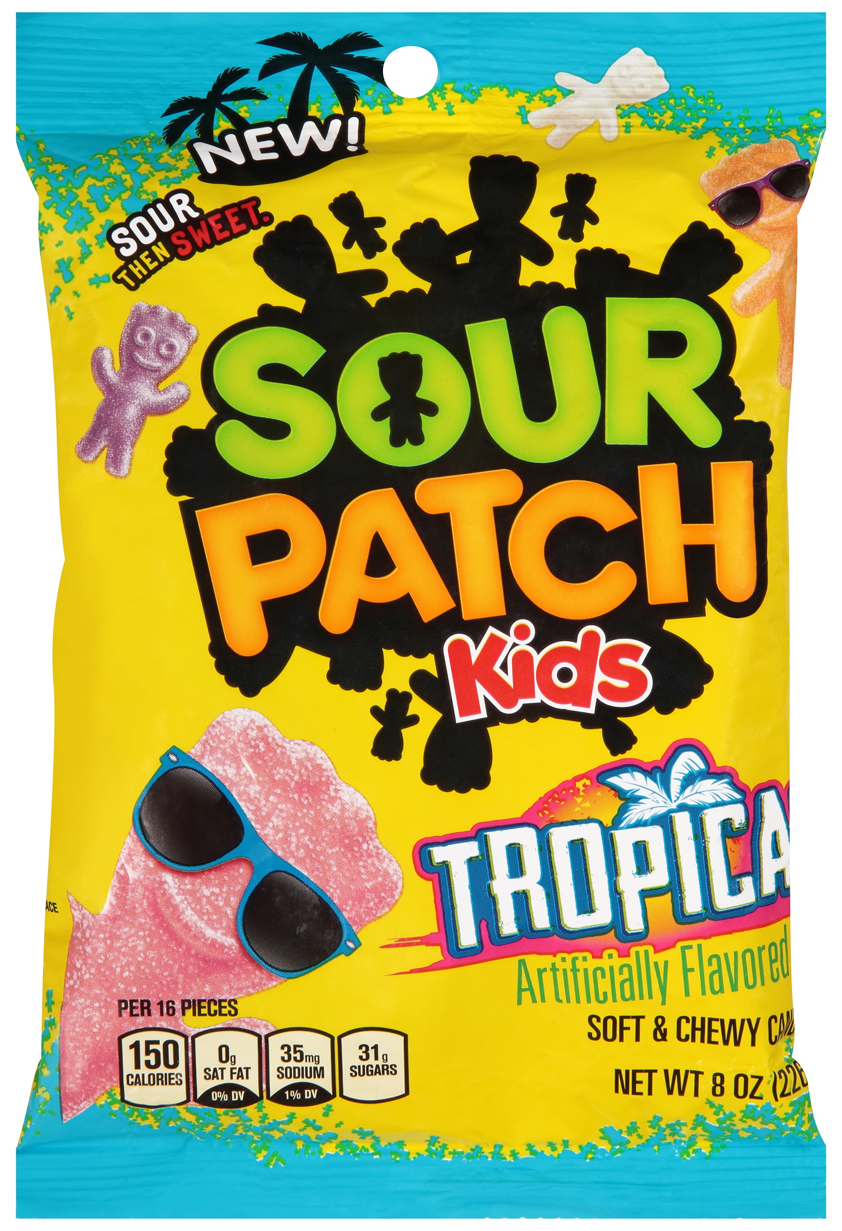Popular sour gummy brand. Exotic tropical shapes. Vibrant and playful packaging. Take customers on a tour of sour then sweet flavors of the tropics with Sour Patch Kids Tropical. Your selection with be overflowing with the flavors of paradise with Sour Patch Kids coated in crunchy sanding sugar and full of exotic flavors like paradise punch, pineapple, tropical twist, and passion fruit. With a vibrant peg bag featuring iconic Sour Patch Kids branding, customers won't need a map to spot this delightful sour candy.
