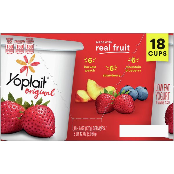 Stop and enjoy the moment with Yoplait Original Strawberry, Harvest Peach and Mountain Blueberry Low Fat Yogurt Pack. With 150 calories per serving, this low fat yogurt cup delivers the smooth, creamy and perfectly sweet flavors of strawberry, peach and blueberry in every delicious spoonful. Made with live and active yogurt cultures and real fruit, Yoplait Original yogurt contains no artificial flavors, no high fructose corn syrup and no colors from artificial sources for a snack you can feel good about. This strawberry, peach and blueberry yogurt variety pack is also a good source of vitamin D and an excellent source of vitamin A and calcium. The perfect single serve snacks for busy families, grab a cup of gluten free yogurt for part of breakfast on the go, pack Yoplait yogurt cups in a school lunch box or throw a Yoplait yogurt pack into your healthy snacks bag for a family road trip. Blueberry, peach or strawberry yogurt tastes great on its own, paired with crunchy granola or blended into a refreshing yogurt smoothie. Conveniently packaged and portioned in a six ounce individual snack cups, store Yoplait yogurt in the refrigerator and keep cold until you’re ready to grab a spoon and enjoy. Yoplait is a participating Box Tops product. Yoplait brings goodness to everyday moments, one serving of yum at a time.