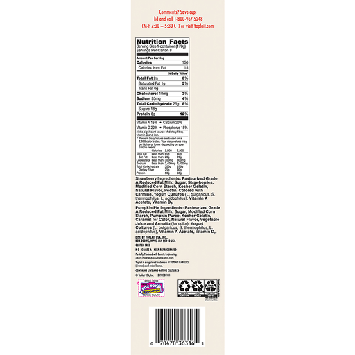 Strawberry Ingredients: Pasteurized Grade a Reduced Fat Milk, Sugar, Strawberries, Modified Corn Starch, Kosher Gelatin, Natural Flavor, Pectin, Colored with Carmine, Yogurt Cultures (L. Bulgaricus, S. Thermophilus, L. Acidophilus), Vitamin a Acetate, Vitamin D3. Pumpkin Pie Ingredients: Pasteurized Grade a Reduced Fat Milk, Sugar, Modified Corn Starch, Pumpkin Puree, Kosher Gelatin, Caramel for Color, Natural Flavor, Vegetable Juice and Annatto (for Color), Yogurt Cultures (L. Bulgaricus, S. Thermophilus, L. Acidophilus), Vitamin a Acetate, Vitamin D3.
