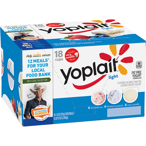 Yoplait Light Fat Free Yogurt Strawberry, Blueberry Patch, Very Vanilla. No aspartame. No high fructose corn syrup. Good source of protein. 6 strawberry. 6 blueberry patch. 6 very vanilla. 18 cups. 18 - 6 oz (170g) servings/6 lb 12 oz (3.06kg). 90 calories per serving. Vitamin A & D. Yoplait yogurt is Fat Free, an Excellent Source of Vitamin D and a Good Source of Calcium & protein. Did we mention it's also gluten free It Is So Good!®. Gluten free. Yoplait is a registered trademark of Yoplait marques (France) used under license. Yoplait light: 90 calories; 0g fat. Leading low fat yogurt: 150 calories; 2g fat per 6 oz. Partially produced with genetic engineering. Contains live & active cultures. Paper, carton. Foil seals. Check locally*. Plastic cups. *Not recycled in all communities. how2recycle.info. Comments Save cup, lid and call 1-800-967-5248 (M-F 7:30 - 5:30 CT) or visit www.yoplait.com. Learn more at ask.generalmills.com.