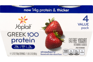 Yoplait® Greek 100 Protein Fat Free Yogurt Strawberry. Now 14g protein & thicker. 14g protein. 100 cal. 7g sugars. 4 value pack. Strawberry flavored with other natural flavor. Fat free yogurt. Vitamin D added. Per serving. 100 calories. 0g sat fat, 0% DV. 55mg sodium, 2% DV. 7g sugars. 4-5.3 oz (150g) servings/1 lb 5.2 oz (601g). Yoplait Greek 100 is now packed with 14g of protein and a thicker texture. Without colors or flavors from artificial sources, it is 100 hardworking calories with real fruit and delicious taste crafted from Yoplait. Enjoy it! Gluten free. No Gelatin. Grade A Contains live and active cultures. Yoplait is a registered trademark of Yoplait marques (France) used under license. Try more of our delicious, creamy Yoplait Greek 100 protein flavors! Blueberry. Strawberry cheesecake. Apple pie. Discard lid & rinse cup. Paper box. Check locally. Plastic cup. *Not recycled in all communities. how2recycle.info. 100% recycled paperboard. Comments Save cup and call 1-800-967-5248 (M-F 7:30 - 5:30 ct) or visit yoplait.com. ©Yoplait USA, Inc.
