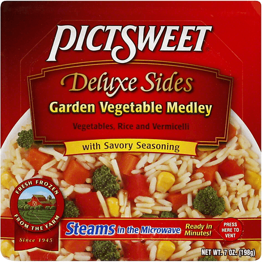 Vegetables, rice, vermicelli. Fresh frozen from the farm. Since 1945. Steams in the microwave. Ready in minutes! This unique package is designed for your microwave. In just minutes you can steam vegetables perfectly to lock in their original flavor, freshness, nutrition, crisp texture and rich color. Pictsweet Vegetables. Fresh frozen from the farm since 1945.
