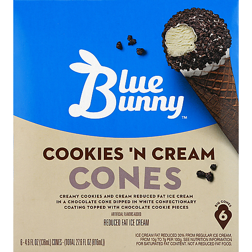 Creamy cookies and cream reduced fat ice cream in a chocolate cone dipped in white confectionary coating topped with chocolate cookies pieces. Artificial flavors added. Reduced fat ice cream. Ice cream fat reduced 30% from regular ice cream, from 10 g to 7 g per 100 g. See nutrition information for saturated fat content. Not a reduced fat food. Look! Top-notch toppings! One generous scoop of ice cream. Crispy crunchy sugar cone. Psst hidden treasure. Blu knows best. It's not a brainfreeze. It's a forehead celebration. Recyclable. Years & years with bunny ears. Wells - Since 1913. Get the play-by-play on all things ice cream. Blu wants you on the iscream team.