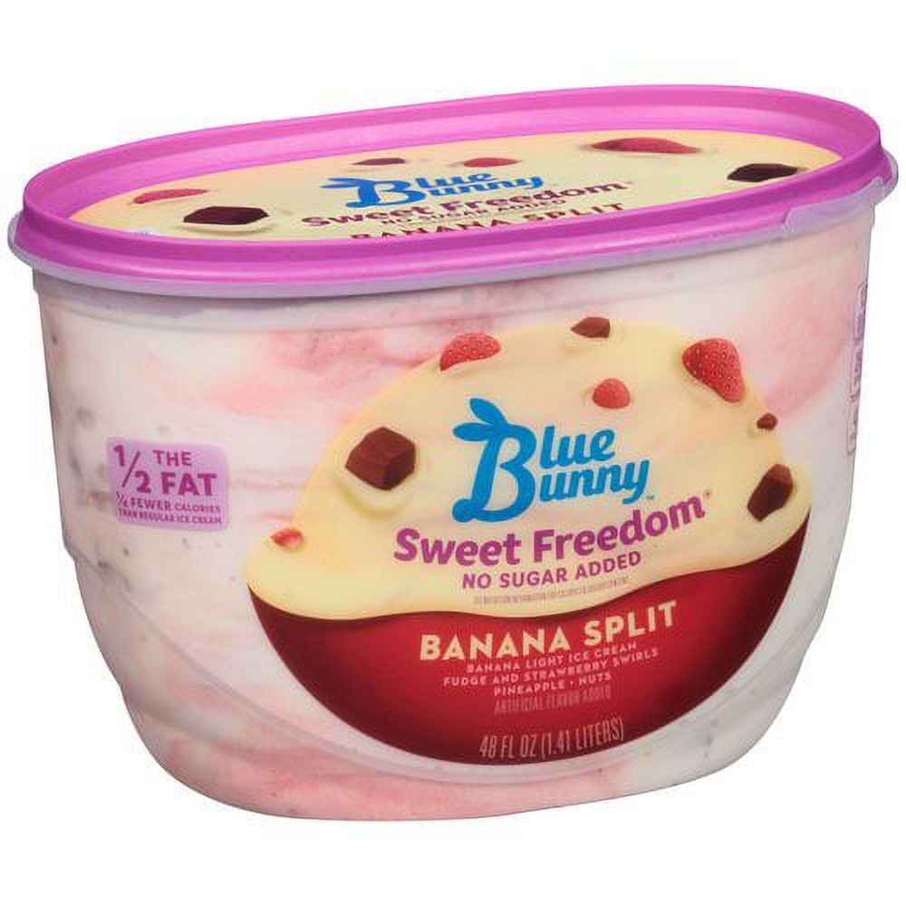 Banana light ice cream fudge and strawberry swirls; pineapple; nuts. No sugar added. See nutrition information for calories & sugars content. Artificial flavor added. 1/2 the fat. 1/4 fewer calories than regular ice cream. 130 calories per serving; 28 g carbs (9% DV); 4 g total fat (6% DV). What you see is what you'll love. So grab a spoon, dig in and see for yourself. From our family to yours, the most fun-filled ice cream in the world is made in Le Mars, Iowa. bluebunny.com. We welcome your question or comments. Call us weekdays 8 am to 5 pm CST. Fat reduced 60%, from 10 g to 4 g and calories reduced 31%, from 190 to 130 per serving from the leading national brands of ice cream. Years & years with bunny ears. Since 1913.