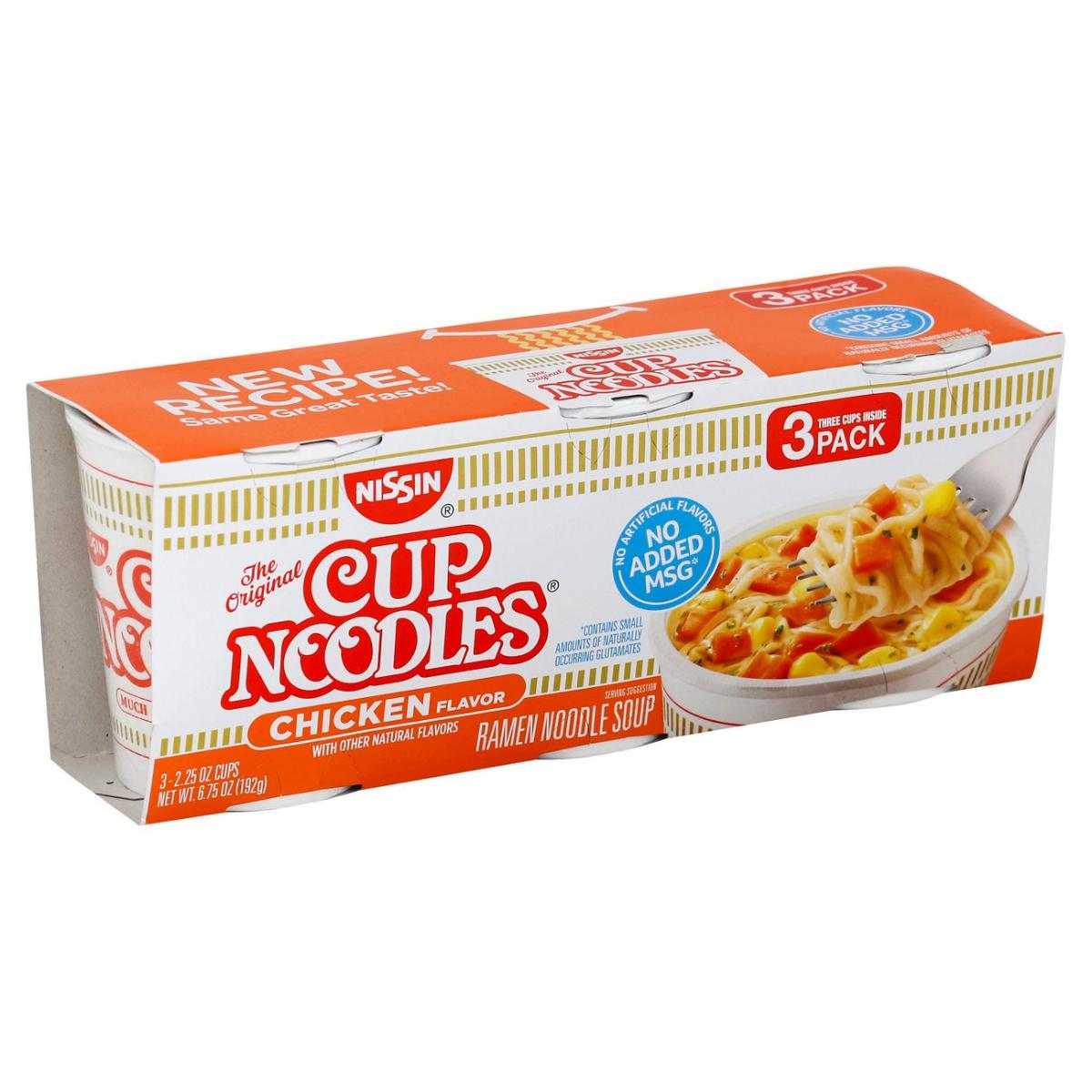Three cups inside. With other natural flavors. The original. No artificial flavors. No added MSG (Contains small amounts of naturally occurring glutamates). New recipe! Same great taste! Partially produced with genetic engineering. We've removed the added MSG and now only use natural flavors. Please visit us at www.nissinfoods.com. For the very best in ramen noodle soup.
