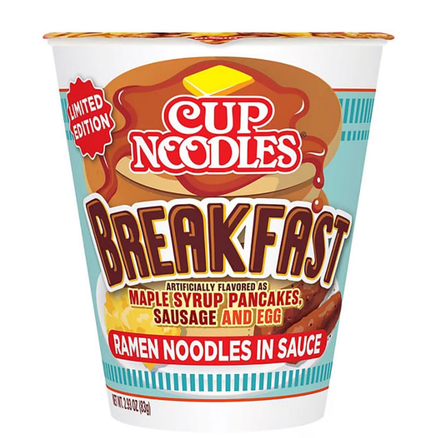 Cup Noodles BREAKFAST features ramen in a sauce that taste like pancakes, maple syrup, sausage and eggs. LIMITED EDITION Ready to eat in 4 minutes (microwaved).