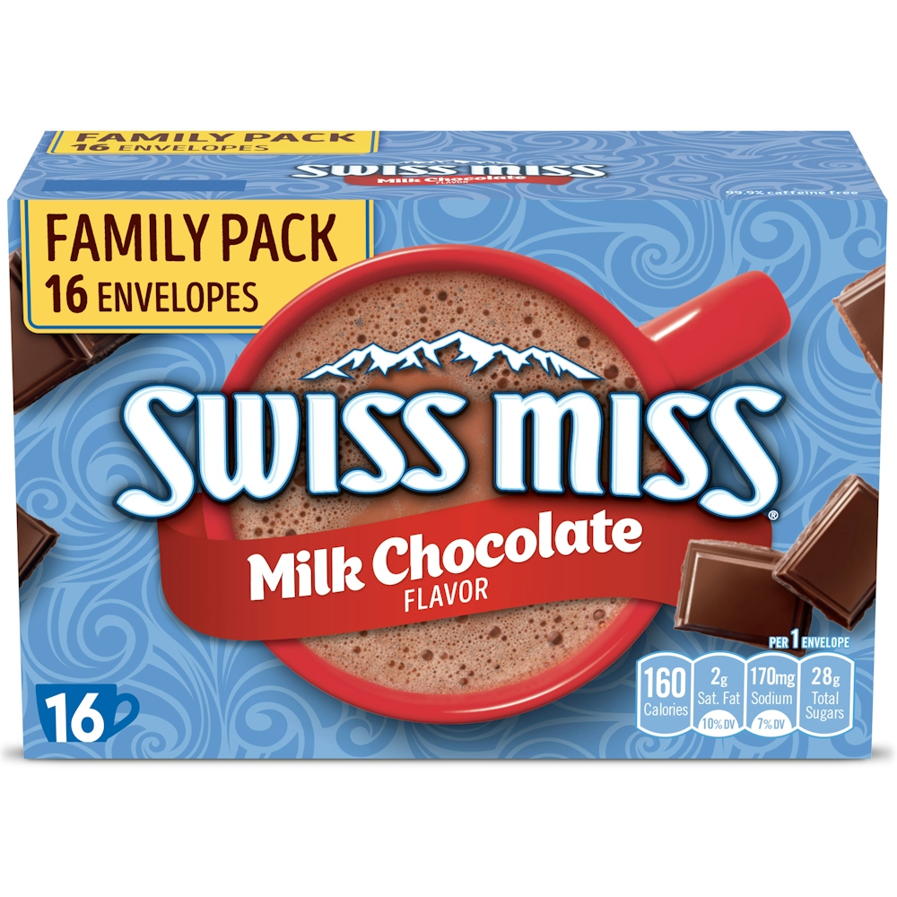 Savor the classic taste of hot cocoa with Swiss Miss Hot Cocoa Drink Mix, Milk Chocolate flavor. Rich, creamy and chocolatey, this hot cocoa mix delights on a cold day or whenever you're craving a mug of hot cocoa. With this family pack box of 16 individual cocoa mix packets, there's plenty to share. Whip up a cup or two by emptying cocoa mix into a mug, adding hot water or milk for a more decadent taste, then stir, sip and savor. When prepared according to package directions, this Swiss Miss cocoa makes a 33% larger mug* than the next leading brand. Swiss Miss Milk Chocolate flavor cocoa contains no artificial sweeteners, preservatives, flavors or colors and is 99.9% caffeine-free.
