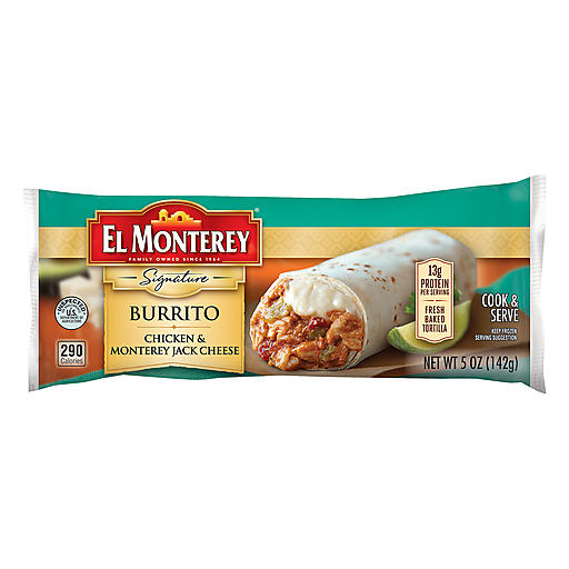 El Monterey® Chicken & Monterey Jack Cheese Burrito. Family owned since 1964. Signature. Microwaveable. Cook & serve. Inspected for Wholesomeness by U.S. Department of Agriculture.
