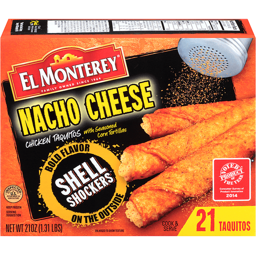 - The product category for El Monterey, Chicken Taquitos with Seasoned Corn Tortillas, Nacho Cheese, Nacho Cheese is Fresh & Frozen Meats.