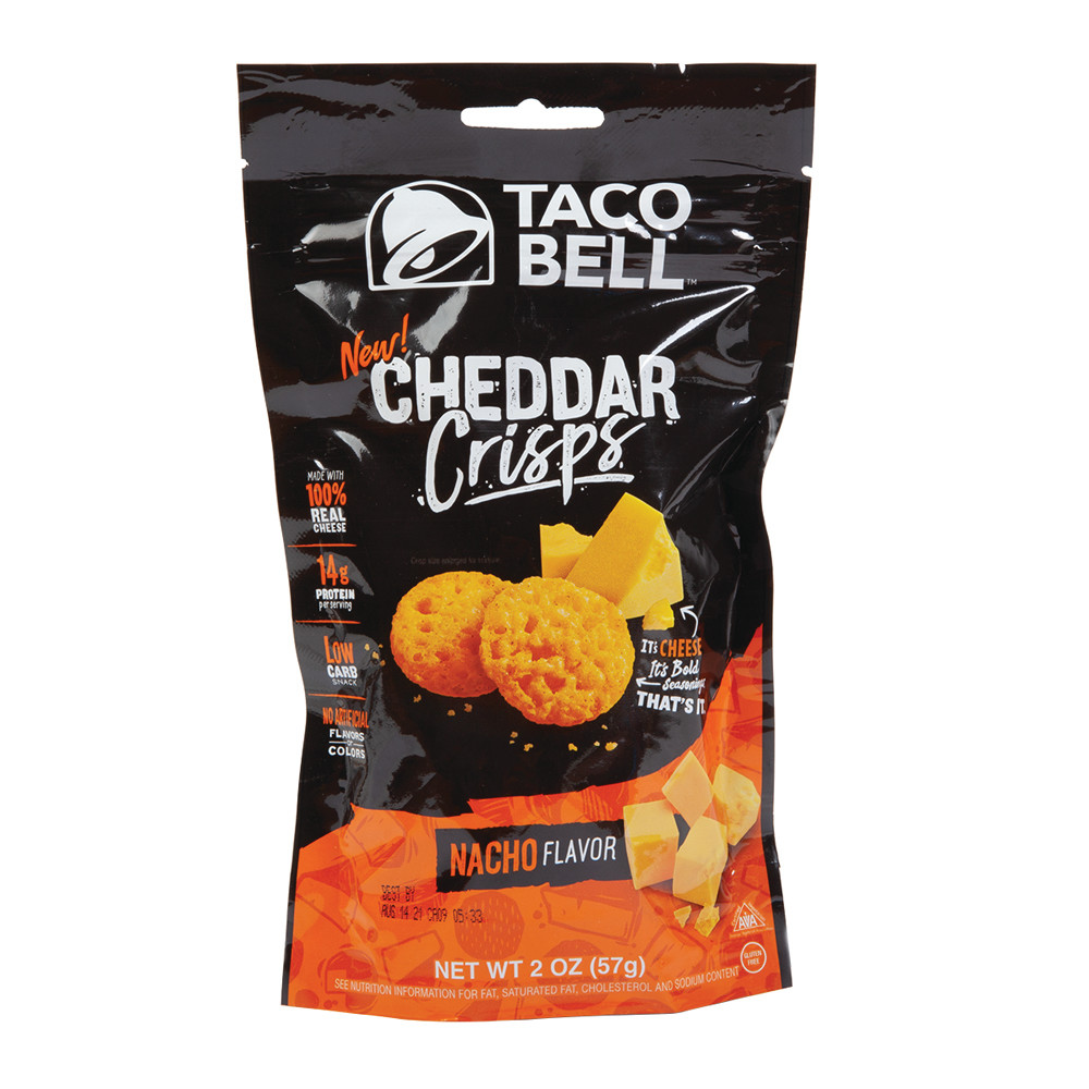 Inspired by our iconic Taco Bell menu items, Taco Bell brings you Taco Bell Nacho Flavor Cheddar Cheese Crisp Crackers. Oven-baked with 100% boldly seasoned real cheese makes this a delicious high protein cheese snack that is low-carb, keto friendly and certified gluten-free. Taco Bell Nacho Flavor Cheddar Crisps are great right out of the bag for a snack at home or on the go. Also try out as a topping for your salad, soup, tacos, burgers and more.