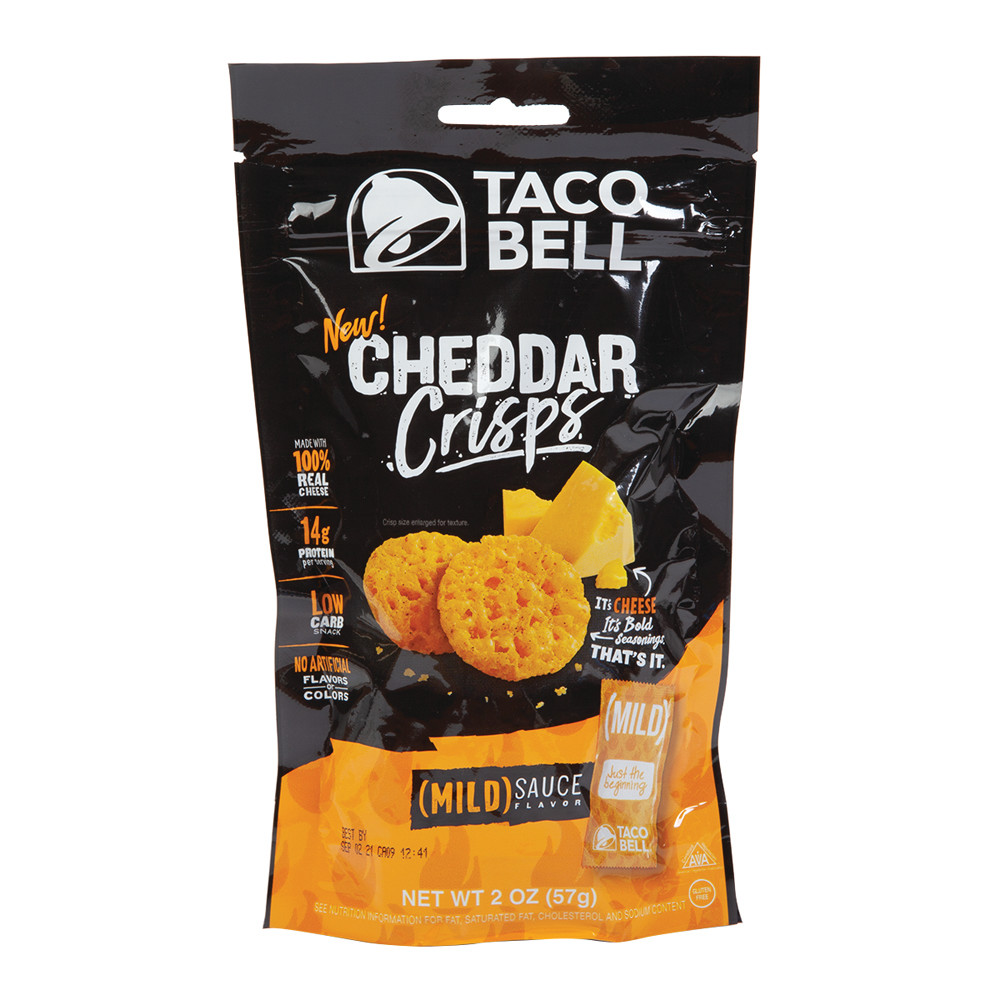 * Taco Bell Mild Cheddar Crisps are oven baked and made with 100% cheese. * Popular fast food brand name gets recognition. * Bright packaging speaks to hungry shoppers. A distinctive bag with Taco Bell branding sets these cheddar crisps apart from the all the rest. Taco Bell Nacho Cheddar Crisps are a good source of protein, are low carb, and contain no artificial flavors. Made with 100% real cheese, the wholesome goodness and savory nacho flavor will be an instant hit with customers. Taco Bell Cheddar Crisps are gluten-free.