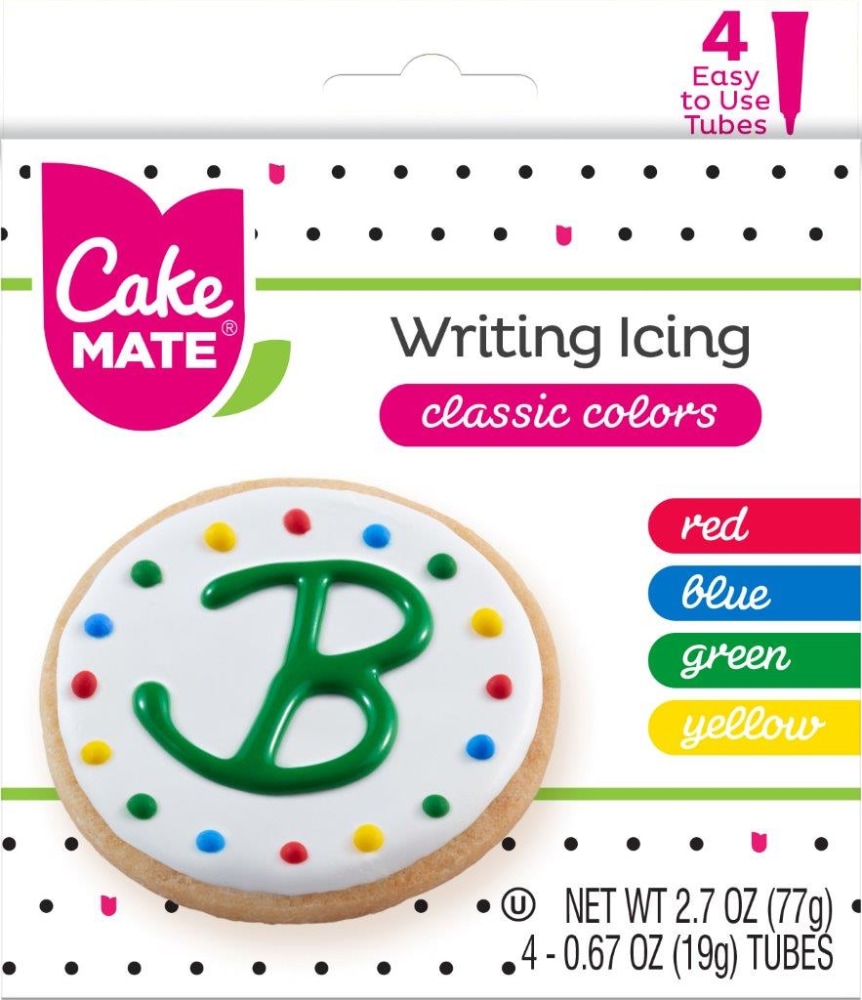 Gluten Free. Red. Blue. Green. Yellow. 4 Easy to use tubes. Cake Mate Writing Icing makes decorating fun and easy. The bright colors will stand out on any treat. Best of all, the icing sets-up dry so cookies can be easily stacked. www.cakemate.com.