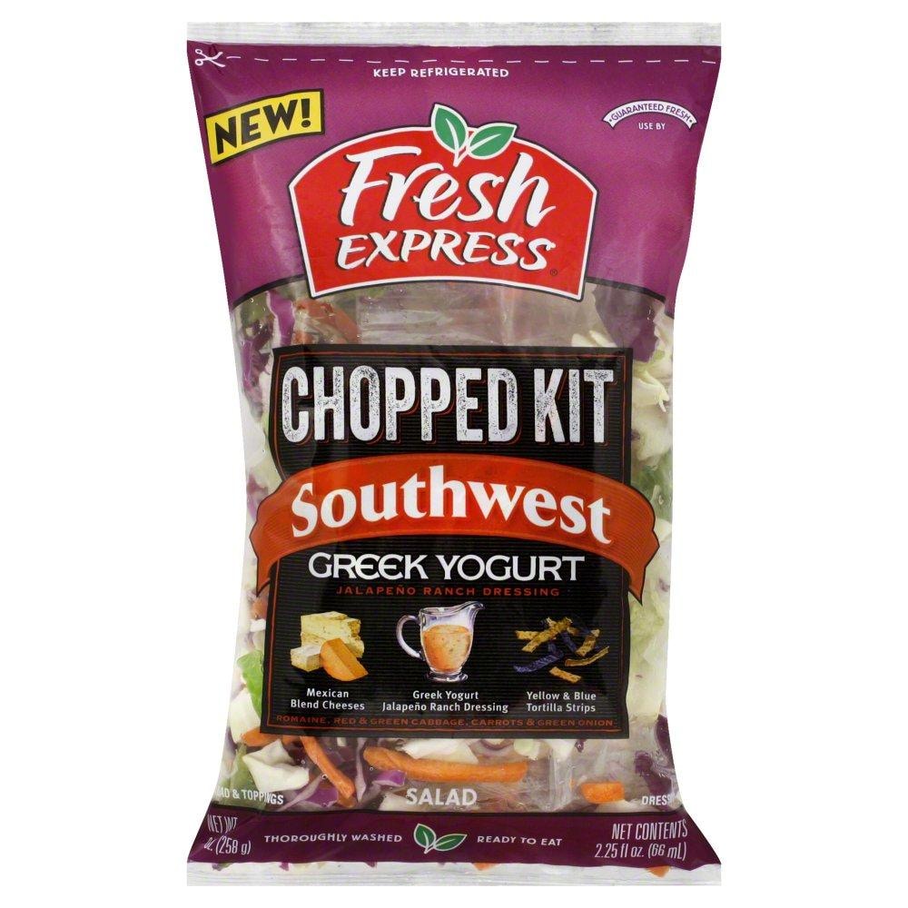Fresh Express Southwest Greek Yogurt Chopped Salad Kit contains spicy chipotle dressing, Mexican seasoned cheeses, yellow &blue tortilla strips. The chopped salad is made of crispy green cabbage, romaine lettuce and sweet carrots.